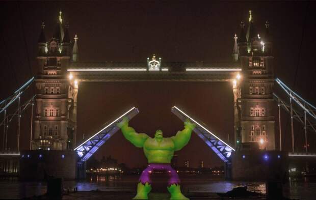 In a swish stunt in London, a 36 ft tall projection of the Hulk ‘raised’ Tower Bridge to, as the PR story goes, ensure safe delivery of the new Disney Infinity video game as it travelled along the Thames in a barge.